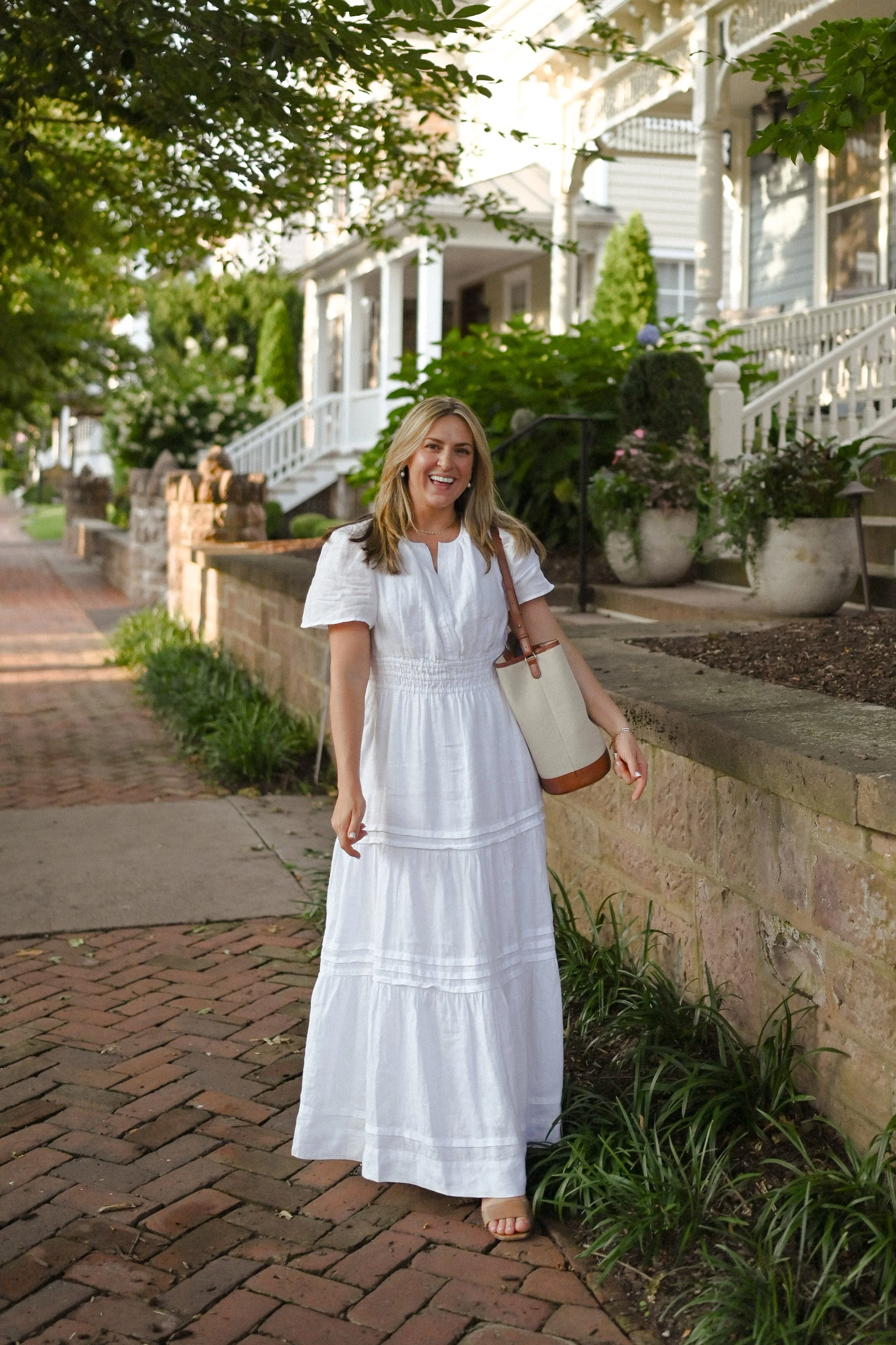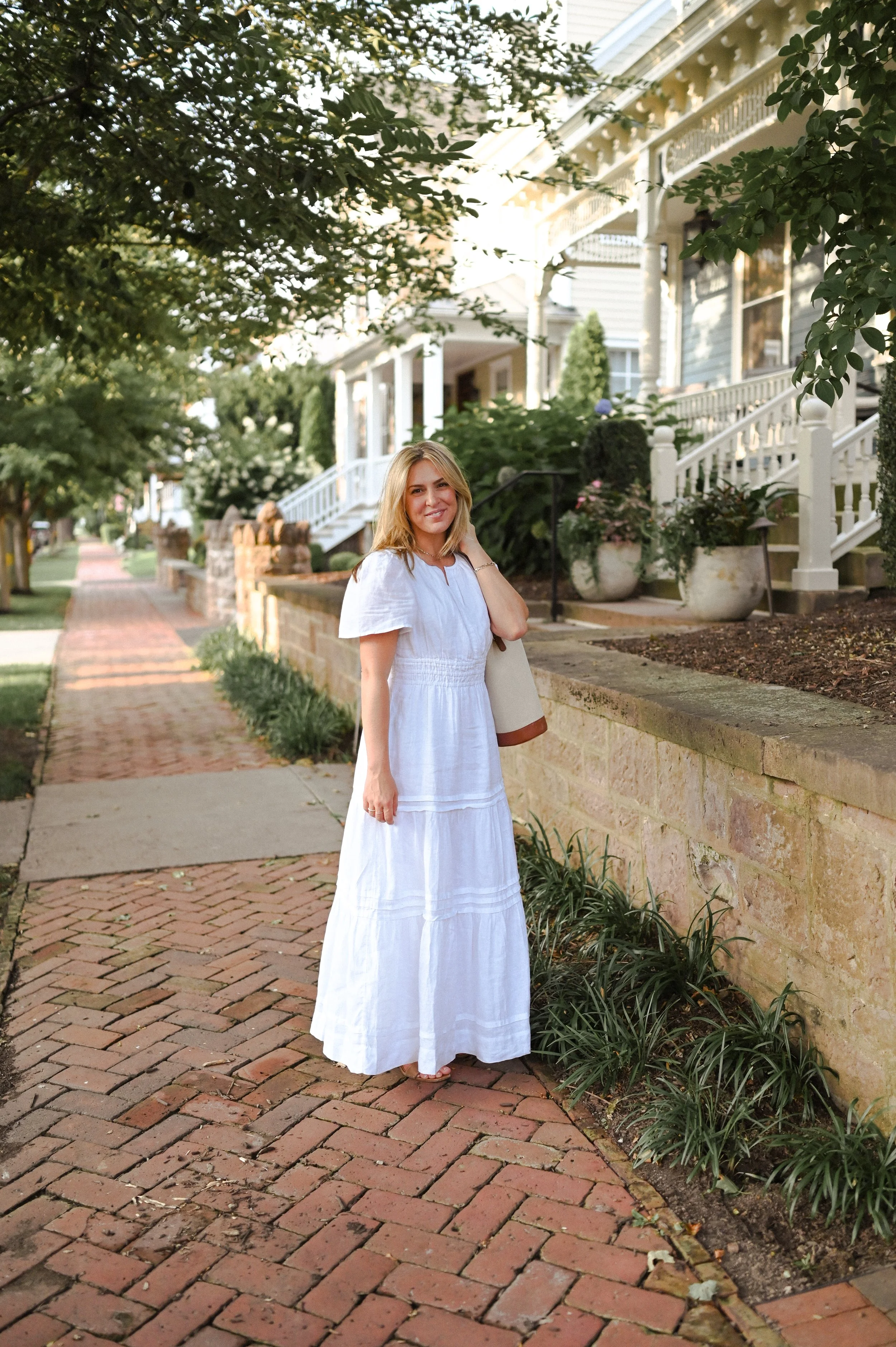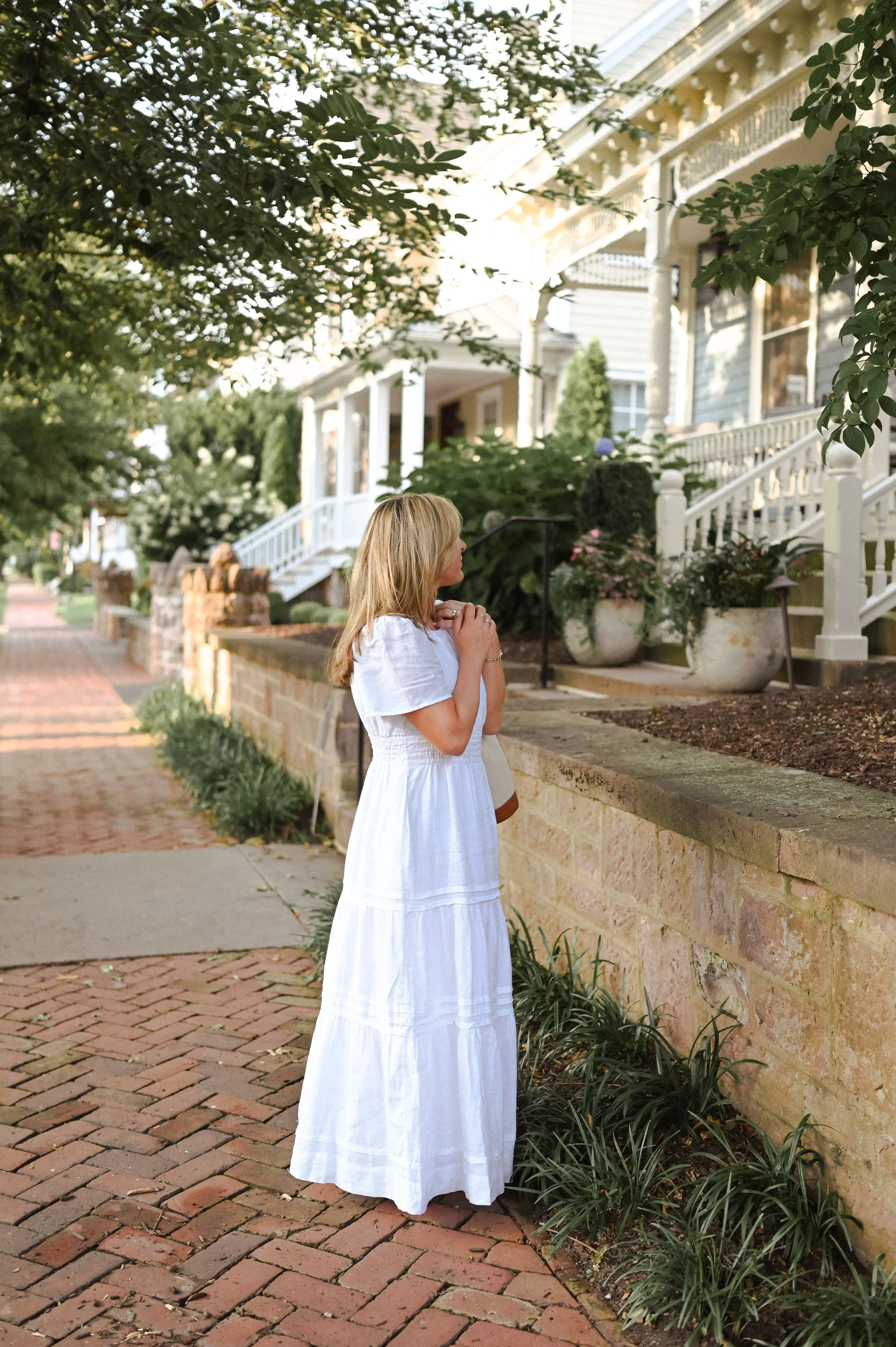 I wore this beautiful linen white dress to a rare dinner date to ring in August. It was perfect summer weather, honestly feeling more like an early autumn night rather than a night in August. The golden sun dipped low and we had the best time people-watching, strolling past the loveliest neighborhood, and ending the night with some fresh made ice cream.
